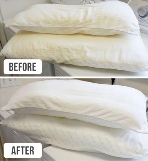 5. Trộn một muỗng bột giặt, một muỗng viên rửa chén đập vụn, một muỗng thuốc tẩy trắng và nửa chén hàn the. Sau đó dùng chế độ nước nóng để giặt. Để chắc chắn độ sạch hơn, bạn có thể đổ nước nóng từ bên ngoài vào máy giặt. Sau đó cứ giặt như bình thường. Chiếc gối sẽ trắng bóng như mới mua.