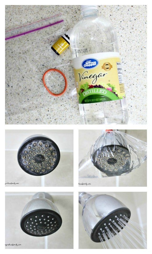 6. Để làm sạch vòi hoa sen, vòi bồn tắm thì đầu tiên hãy làm sạch lớp vôi hóa tích tụ ở vòi bằng giấm. Dùng bàn chải nhúng giấm và cọ lên. Nếu chất vôi hóa vẫn còn, tiếp tục đổ giấm, dùng túi bóng quấn quanh và để khoảng một tiếng nữa. Sau đó rửa lại với nước.
