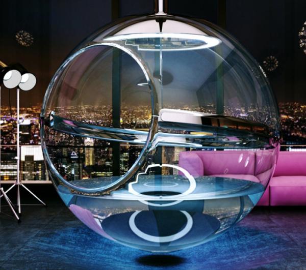 Một chiếc bồn tắm hình quả địa cầu trong suốt như thế này không chỉ đáp ứng tính thẩm mỹ mà còn mang lại nhiều tiện ích đáng ngạc nhiên cho người dùng. Với ý tưởng “không gian nằm trong không gian”, món nội thất này được đánh giá là một sáng tạo kiến trúc tuyệt vời. Sự tích hợp hàng loạt các kỹ thuật hiện đại như thông báo để chủ nhân điều chỉnh các thông số về ánh sáng, nhiệt độ, độ ẩm, hương thơm, âm thanh cùng chế độ khử mùi thông minh… Bước vào bồn tắm, bạn như lạc vào vũ trụ và tận hưởng cảm giác không trọng lượng cực kỳ thú vị.