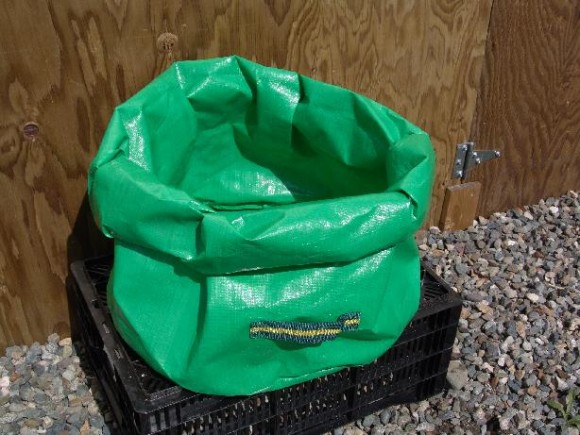 Tận dụng những chiếc túi cũ trong nhà để trồng khoai tây. Đầu tiên, bạn chọc một vài lỗ ở dưới đáy để thoát nước. Tiếp sau đó cuộn hai bên của túi xuống để không dễ bị đổ. Cuối cùng, đổ đầy đất hữu cơ sao cho cách miệng túi khoảng 10cm.