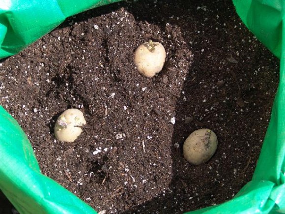 Tùy vào kích thước của túi mà bạn trồng số lượng củ phù hợp. Ví dụ như bao tải thì trồng được khoảng 4 - 5 củ trong một túi. Khi trồng, hãy để mầm khoai hướng lên trên rồi nhẹ nhàng dùng tay vun đất lại che khuất một nửa củ khoai tây và tránh để gãy mầm.
