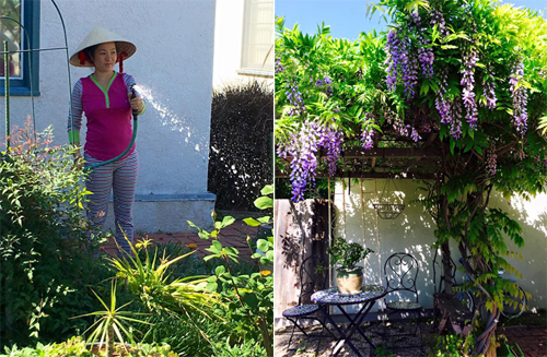 Có nhiều thời gian rảnh rỗi hơn khi ở Việt Nam nên Hồ Lệ Thu, Bằng Kiều... tự đi mua cây, tỉa cành, thu hoạch hoa trái.