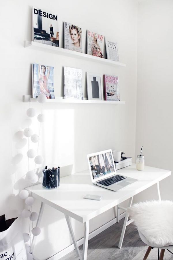 Dành riêng một góc phòng ngủ để trở thành bàn làm việc là một cách vô cùng thông minh. Sẽ rất tuyệt vời nếu bạn tiếp tục trang trí một góc làm việc tông trắng hiện đại và đơn giản để phù hợp với cả không gian phòng ngủ.