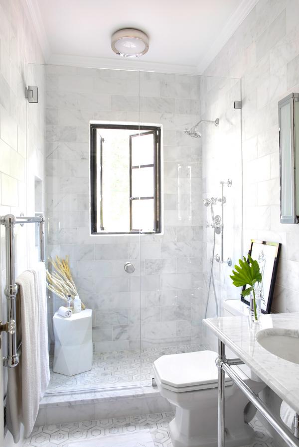 Trong một không gian nhỏ, nên ưu tiên trang trí để cho mắt nhìn khỏi bị phân tâm. Do đó, giải pháp dễ dàng nhất chính là giữ cho không gian được tối giản về màu sắc. Trong phòng tắm toàn trắng này, bồn tắm, tường và gạch cùng các chi tiết trắng đã tạo nên một cảm giác bình yên.