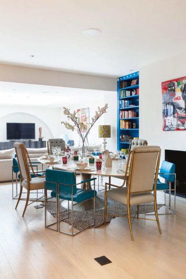 Nếu muốn tìm một điểm nổi bật cho bộ bàn ăn đơn giản của bạn, một chiếc ghế ăn màu sắc như xanh lam sẽ là một điểm nhấn hoàn hảo.